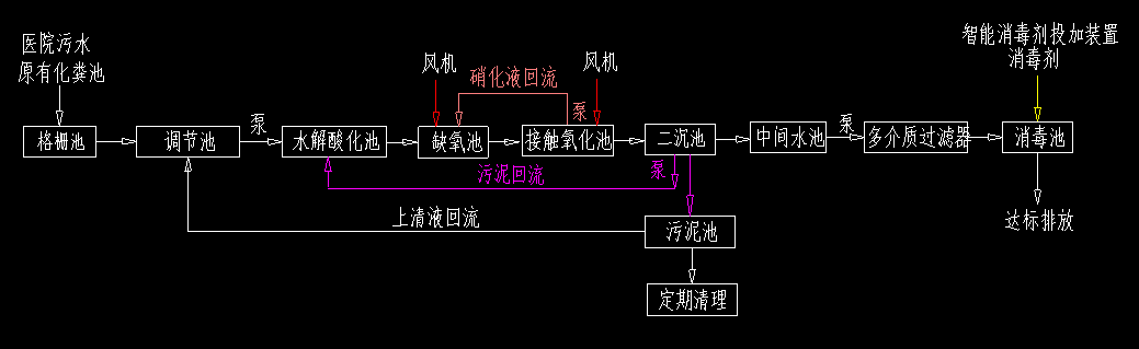 污水處理水源為醫(yī)院廢水,經(jīng)過院區(qū)內的排水管匯集經(jīng)過化糞池后進入醫(yī)院污水處理設備。